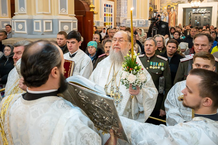 Concelebrating with His Eminence were: Protopriest Evgeny Ivanov, Acting Rector of Almaty Orthodox Theological Seminary and Head of the Information Department of the Metropolis; Hieromonk Antony (Drobyazko), Sacristan of the Church of the Holy Martyrs Faith, Hope, Charity, and Sophia; Protopriest Oleg Kalmykov, Rector of the Church of St. John of Kronstadt in Lisakovsk; Hieromonk Victorin (Aseyev); Hieromonk Daniel (Makagon); Deacon Anatoly Ledenev; and Deacon Roman Frolov.