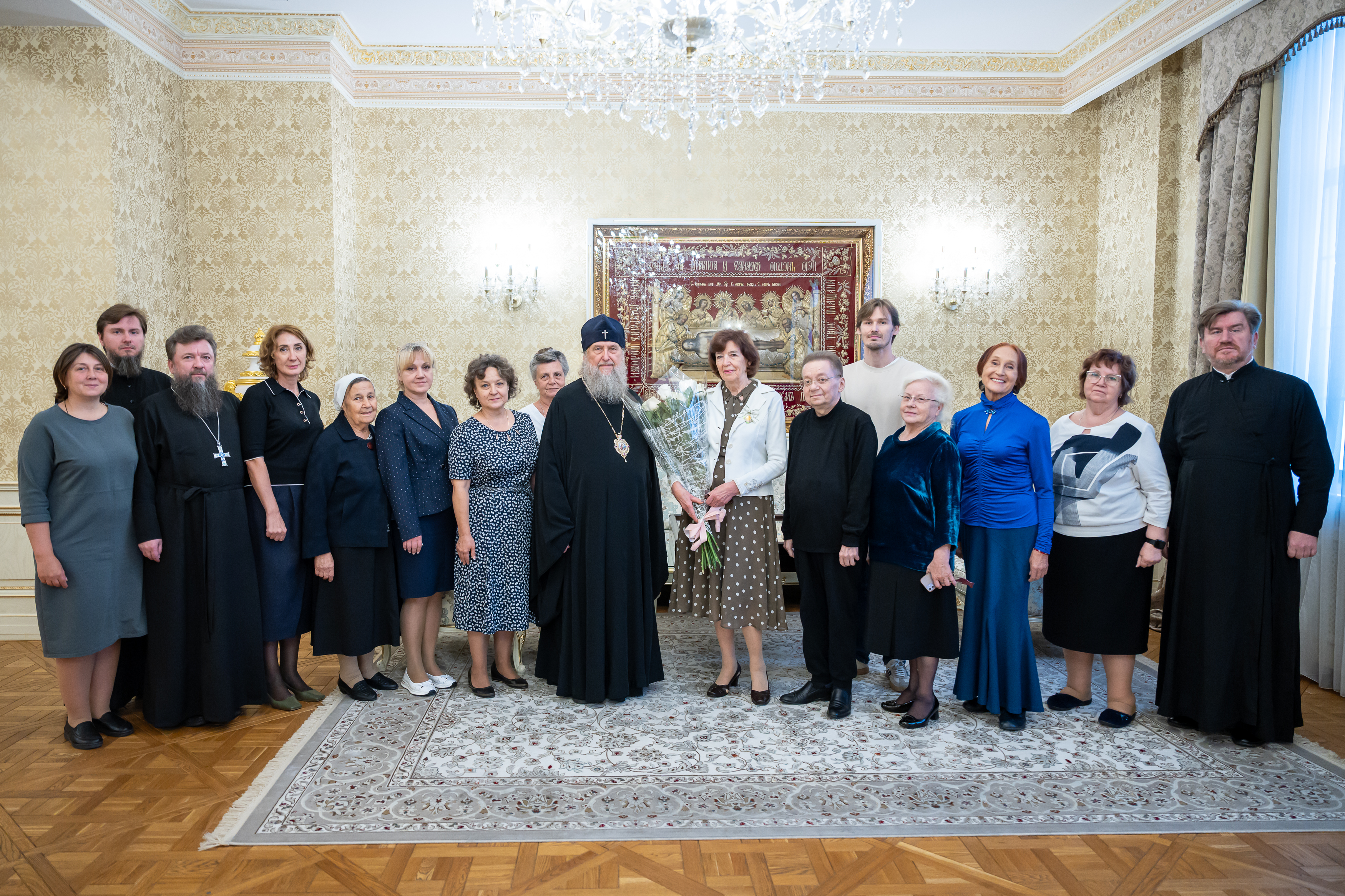 September 23, 2025. Almaty. In the fireplace hall of the spiritual, cultural, and administrative center of the Metropolis of Kazakhstan named after Saint Joseph (Chernov), Metropolitan Alexander of Astana and Kazakhstan congratulated L.G. Frolova, an employee of the Almaty Diocesan Chancellery, on the occasion of her birthday jubilee.