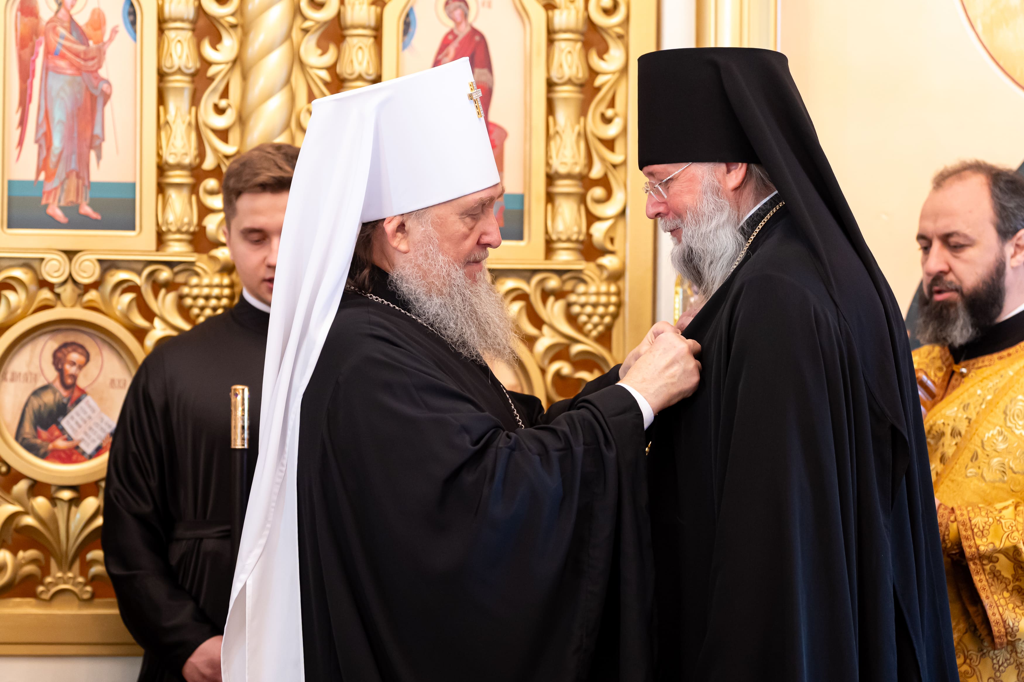 After the service, the Metropolitan congratulated the head of the Taldykorgan Vicariate on the 25th anniversary of his priestly ordination and on his birthday. In recognition of his zealous archpastoral labors for the benefit of the Orthodox Church of Kazakhstan and in connection with the significant date of his pastoral ministry, Bishop Klavdian was awarded the Order of the Holy Hieromartyr Pimen, Bishop of Verniy and Semirechye.