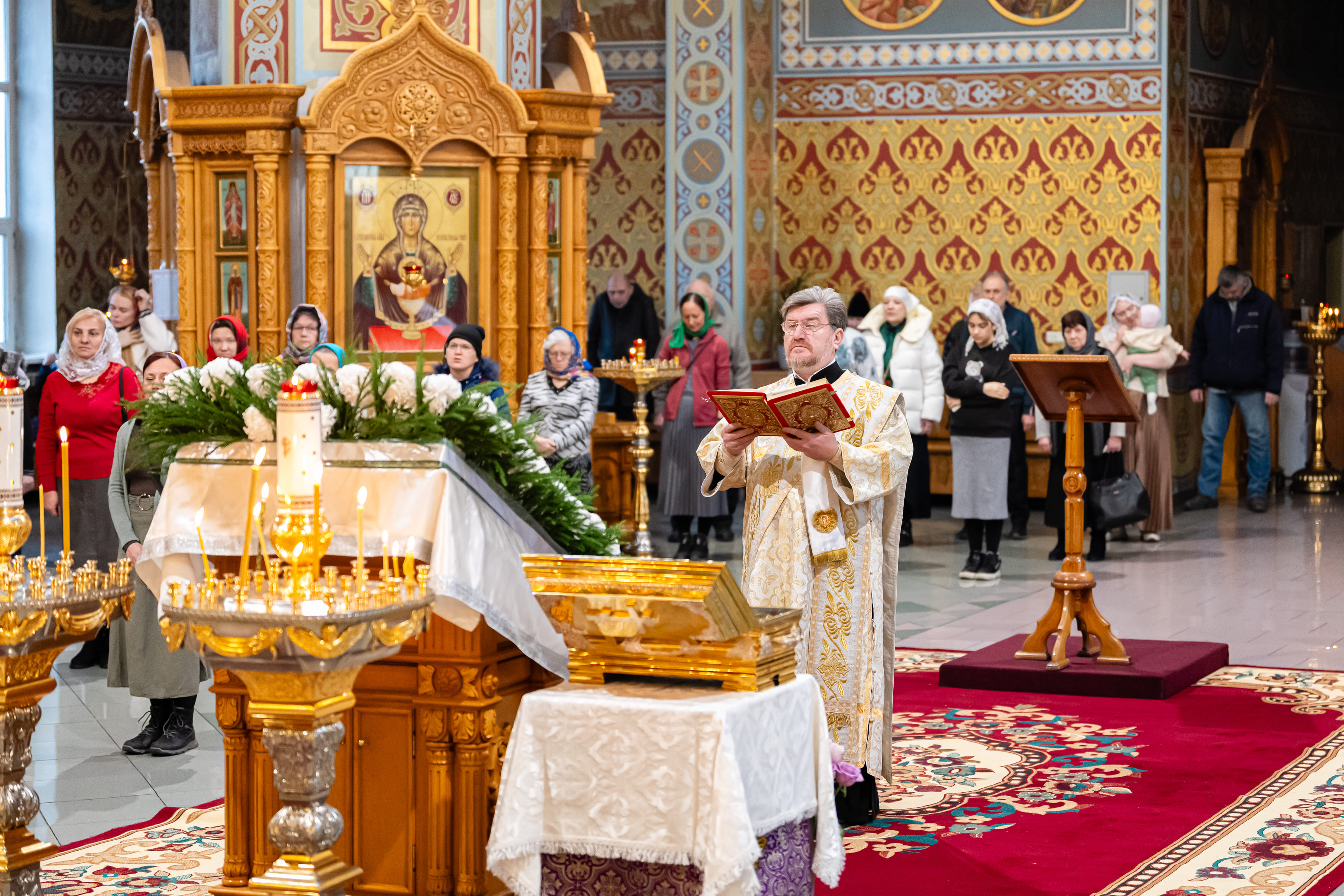 By blessing of Metropolitan Alexander, a reliquary was brought to the service from the Iveron–Seraphim house chapel of the metropolitan residence in Almaty, containing relics of Venerable Seraphim of Sarov, a piece of the stone on which the venerable elder prayed for a thousand days and nights, a strand of his hair, and parts of his clothing and vestments.