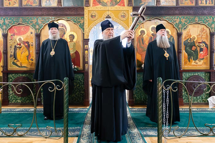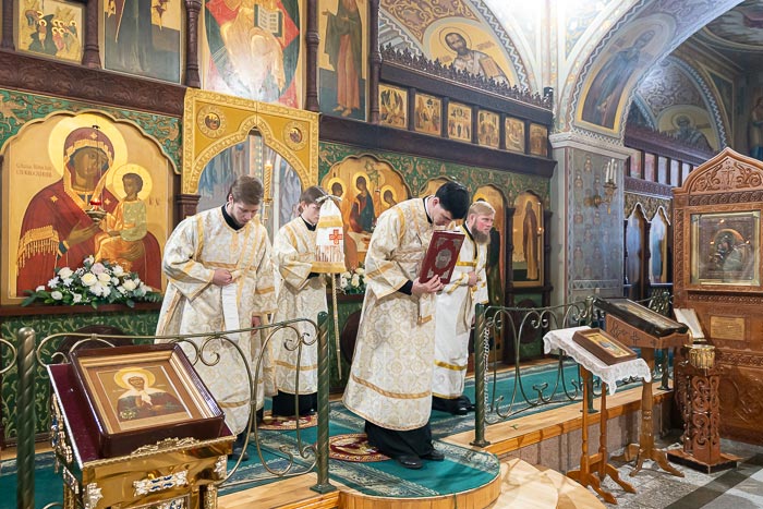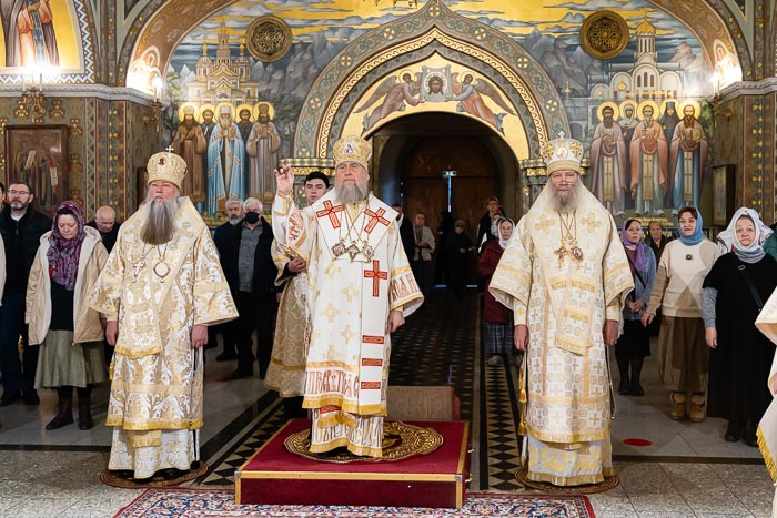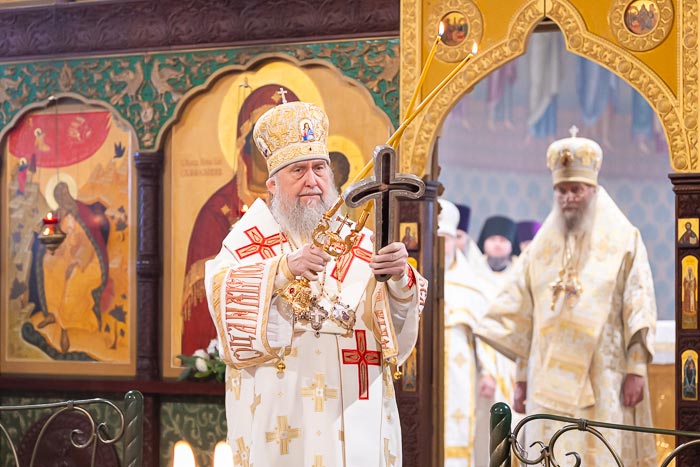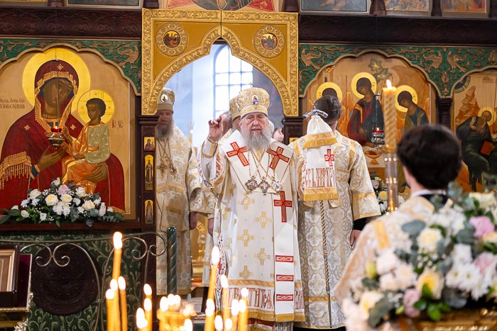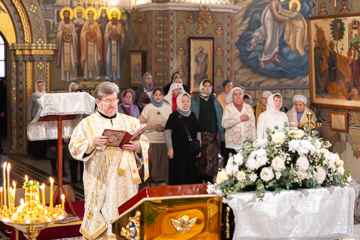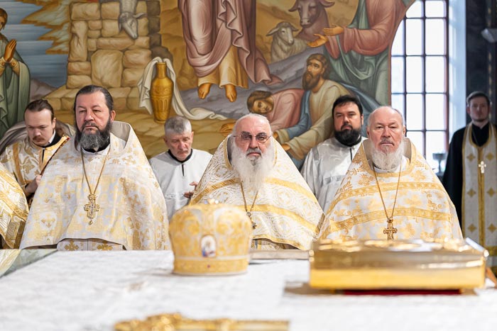 Concelebrating with the Primate of the Orthodox Church of Kazakhstan were: Bishop Klavdian of Taldykorgan and Bishop Veniamin of Talgar, both vicars of the Astana Diocese; Dean of the Churches of the Southern Capital and Rector of St. Nicholas Cathedral, Candidate of Theology, Mitred Archpriest Valery Zakharov; Rector of the Church in honor of the Icon of the Mother of God “Joy of All Who Sorrow,” Archpriest Evgeny Vorobyev; Archimandrite Gavriil (Tutberidze); Rector of the Church of St. Paraskeva, Archpriest Ioann Lopatin; Rector of the Church of the Theophany, Archpriest Valery Shavrin; Head of the Metropolitan’s Personal Secretariat, Hieromonk Prokhor (Endovitsky); Head of the Administrative Secretariat of the Head of the Metropolis, Priest Georgy Sidorov; Sacristan of the Kazan Cathedral in Almaty, Priest Georgy Rublinsky; Head of the Correspondence Department of the Almaty Theological Seminary, Priest Daniil Bobylev; and local clergy. The deacons were led by Protodeacon Nikolai Grinkevich.