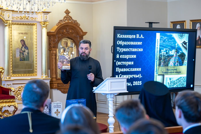 Then the research associate and lecturer of the Almaty Theological Seminary, Archpriest Alexander Suvorov, presented to those gathered the collected works of the local historian V. A. Kazantsev “The Formation of the Turkestan Diocese (The History of Orthodoxy in Semirechye).” Father Alexander served as the editor and compiler of the presented publication.