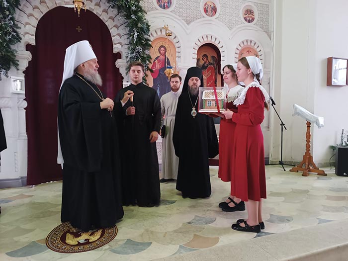 Құлшылық аяқталған соң Покровский храмының балалар хоры регент О. Картаузованың басқаруымен рождестволық мадақ әндерін орындап, әмірші митрополитті және жиналған қауымды құттықтады.