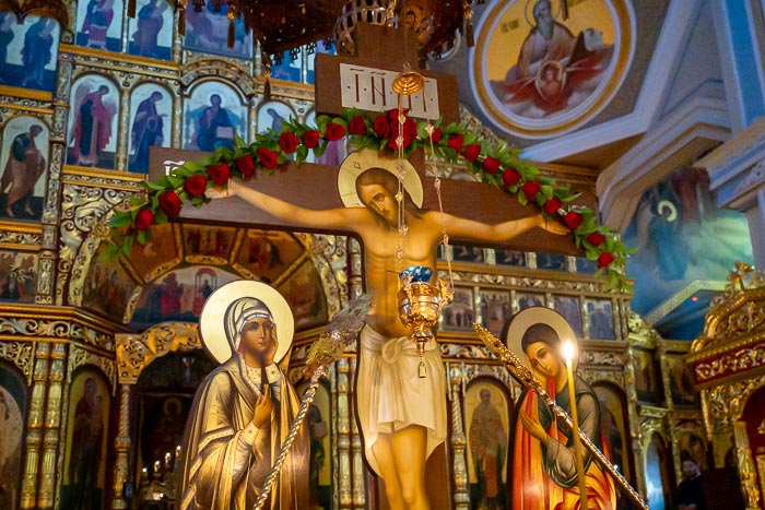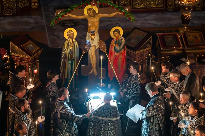 5-ші Інжіл оқылғаннан кейін, «Днесь висит на древе» антифоны орындалғанда, митрополит Александр мен дін қызметкерлері алтарьдан Жаратқан Иенің Жанды Крест ағашының бөлшегі, Иеміз Иса Мәсіхтің Тікен тәжінің бір бөлігі, Иеміздің киімінің бір бөлігі, Қасиетті Гроб пен Голгофа тастарының бөлшектері, Ақылды ұрының крестінің бөлшегі, ұрып-соғу бағанасының бір бөлігі, майлау тасының бір бөлігі және Христос Крестке шегеленген шегенің дәл көшірмесі алып шықты.