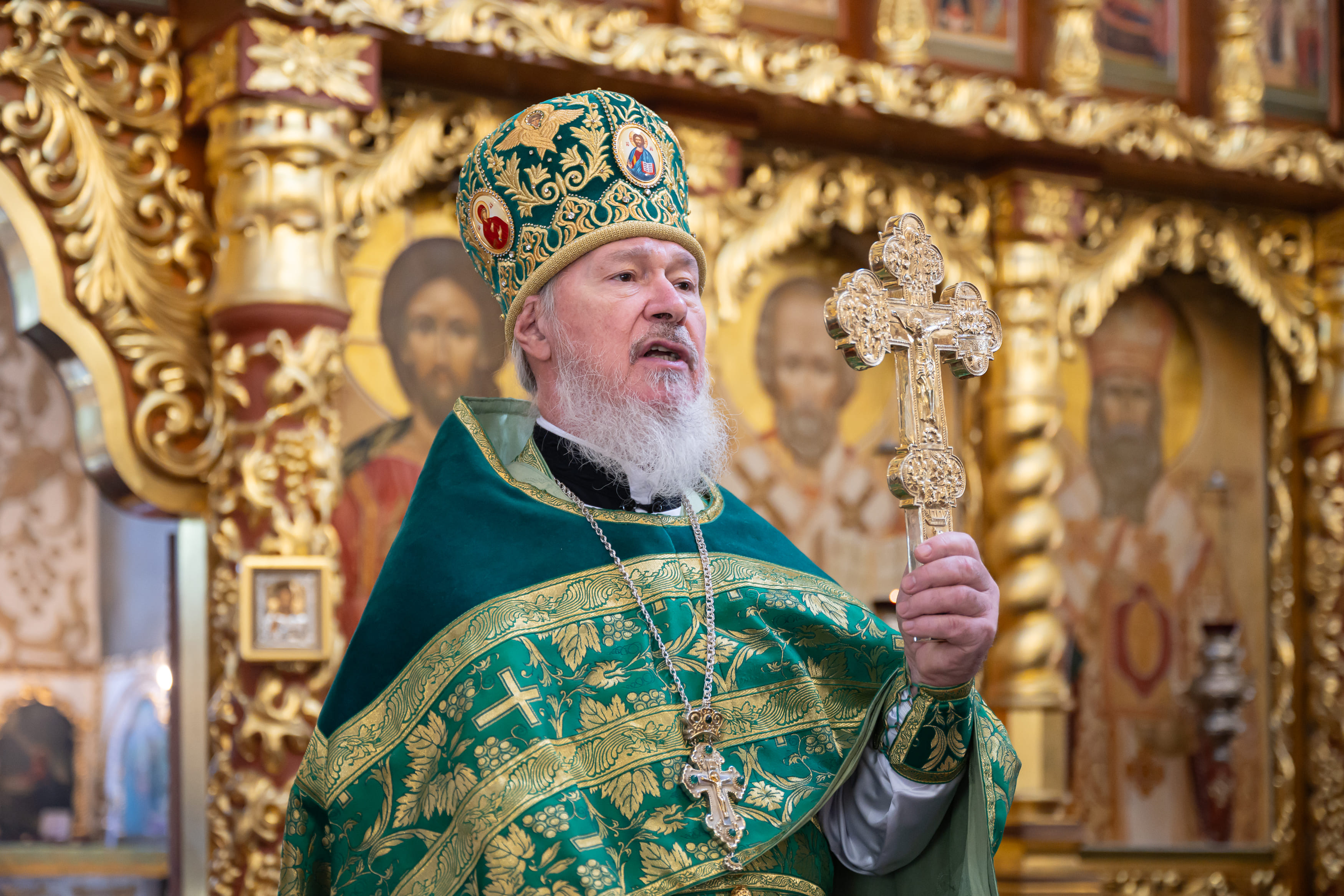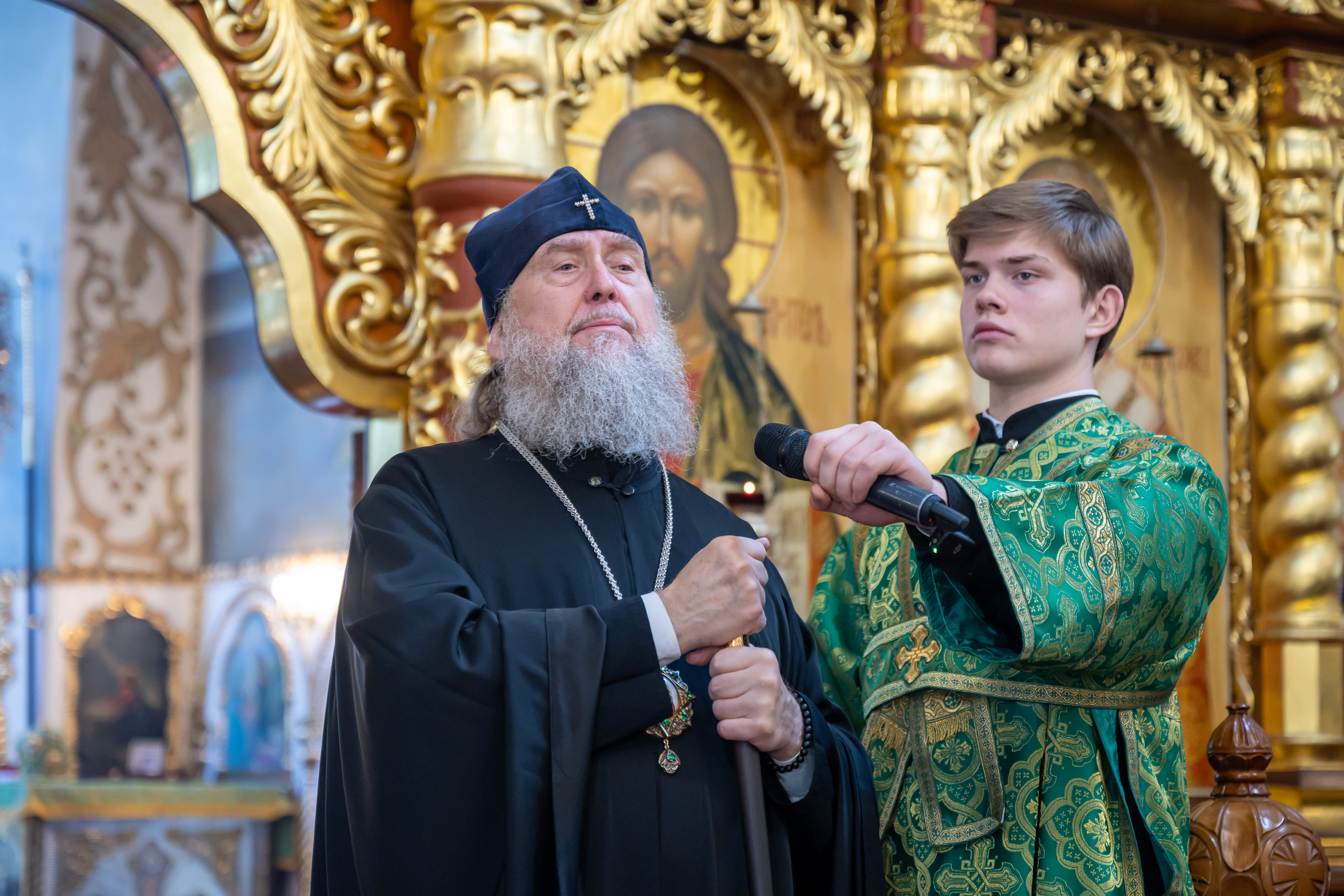 По отпусте Литургии состоялось славление преподобному Сергию, в завершение которого митрополит Александр поздравил именинников с днем небесного покровителя и обратился к собравшимся с проповедью.