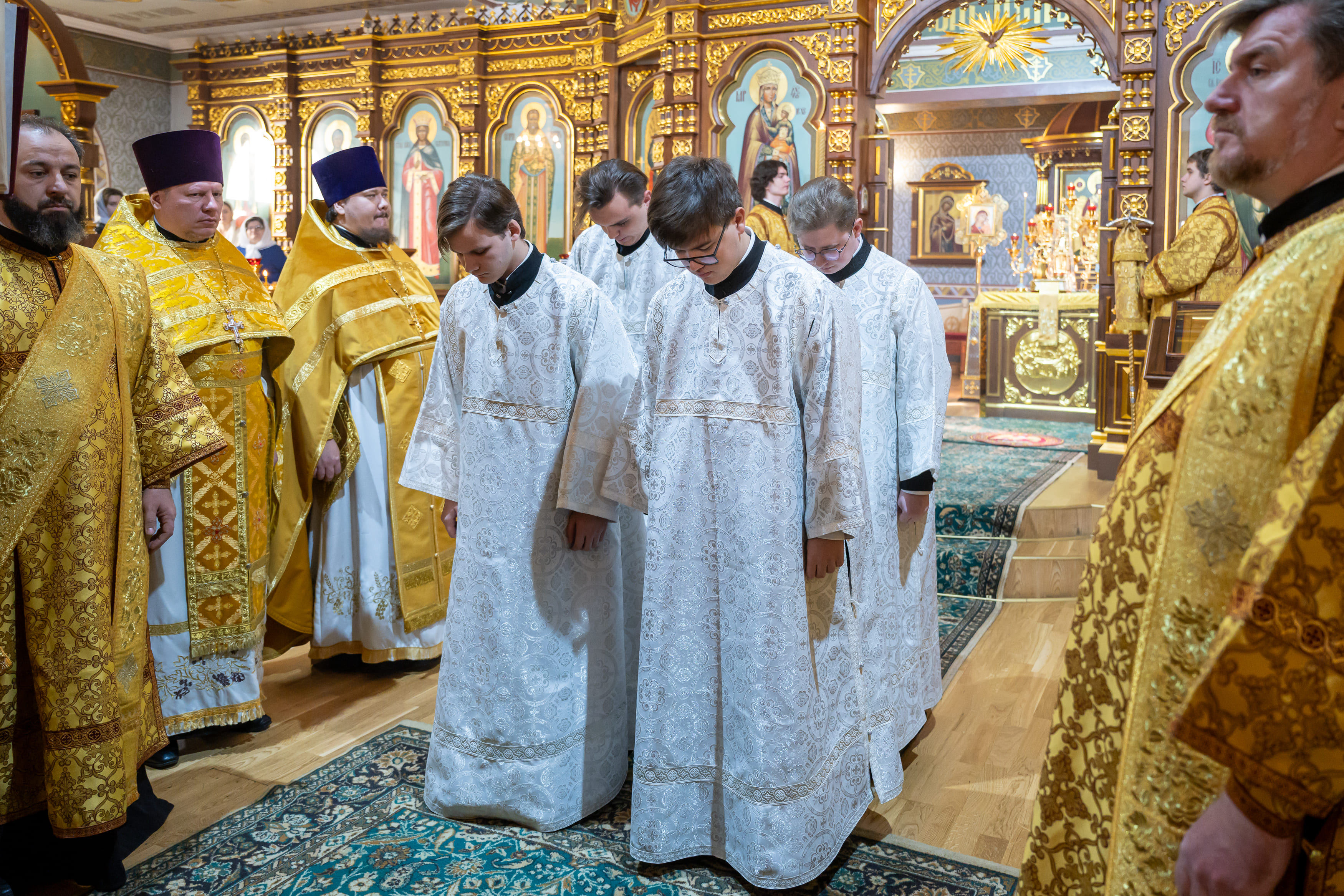 Во время чтения часов Предстоятель Православной Церкви Казахстана совершил постриг во чтецы студентов старших курсов АПДС: Глеба Богданова, Андрея Донского, Рустика Гаппасова, Дмитрия Ядрушкина.