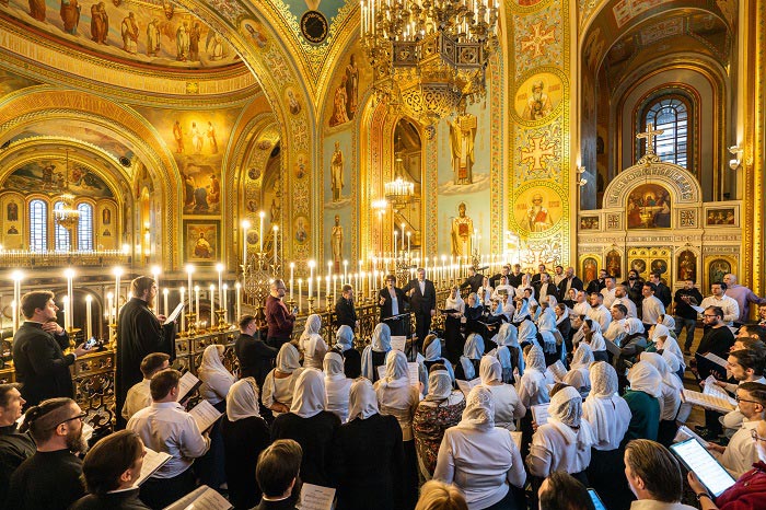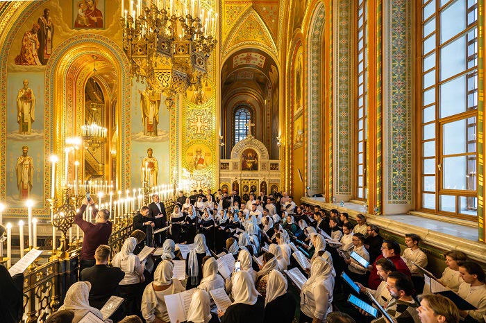 Богослужебные песнопения исполнил Большой сводный хор лауреатов IV Фестиваля «Свет Христов» численностью более 100 человек. В составе хора — 6 хоровых коллективов из епархий Русской Православной Церкви: хор храма благоверного князя Александра Невского г. Петропавловска-Камчатского; Архиерейский хор собора благоверного князя Александра Невского г. Волгограда; Митрополичий смешанный хор Благовещенского кафедрального собора г. Воронежа; Архиерейский хор Псково-Печерского монастыря; Архиерейский хор Костромской митрополии; Архиерейский мужской хор Омской митрополии. Управление хором осуществляли: В.А. Волкова, ответственный секретарь Церковно-общественного совета по развитию русского церковного пения; А.А. Пузаков, руководитель Московского синодального хора; О.Н. Овчинников, Заслуженный деятель искусств России регент хора и секретарь Казахстанского митрополичьего округа, член Церковно-общественного совета по развитию церковного пения.