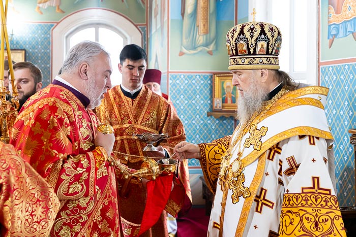 Предстоятелю Православной Церкви Казахстана сослужили: настоятель алма-атинского храма в честь иконы Божией Матери «Всех скорбящих Радость» протоиерей Евгений Воробьев, настоятель Богоявленского храма села Маловодное протоиерей Николай Ткаченко, настоятель Алексеевской церкви поселка Байтерек протоиерей Анатолий Бойко, настоятель Параскевинского прихода города Талгара протоиерей Владимир Барташевич, настоятель Михаило-Архангельского храма села Тургень иеромонах Варсонофий (Ларионов), руководитель личного секретариата митрополита иеромонах Прохор (Ендовицкий), настоятель Александро-Невской церкви села Саймасай (Александровка) иерей Роман Клюев, исполняющий обязанности благочинного Талгарского церковного округа, настоятель Никольского храма города Талгар иерей Кирилл Фрейганг, клирик Алексеевского храма поселка Байтерек иеромонах Алексий (Самосенков), руководитель административного секретариата Главы Митрополичьего округа иерей Георгий Сидоров; ключарь Казанского собора Алма-Аты иерей Георгий Рублинский; протодиакон Николай Гринкевич, руководитель службы протокола митрополита протодиакон Роман Головин, диакон Георгий Ткаченко, диакон Владимир Юдин.
