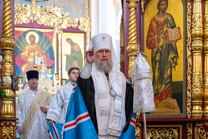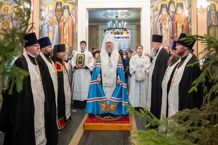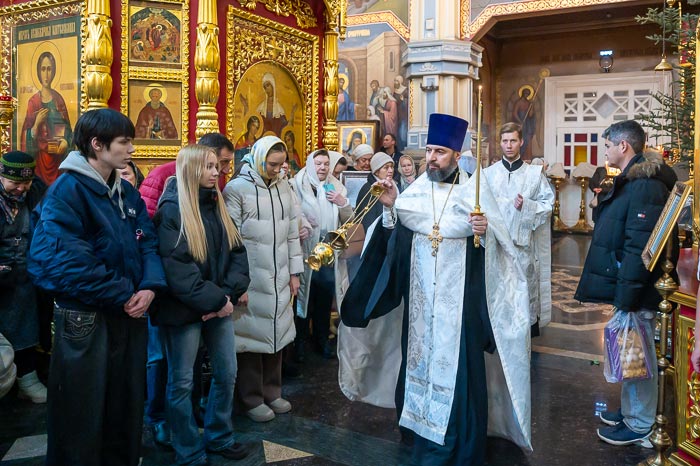 Во время чтения канона митрополит Александр помазал верующих, прикладывающихся к иконе праздника, освященным елеем.