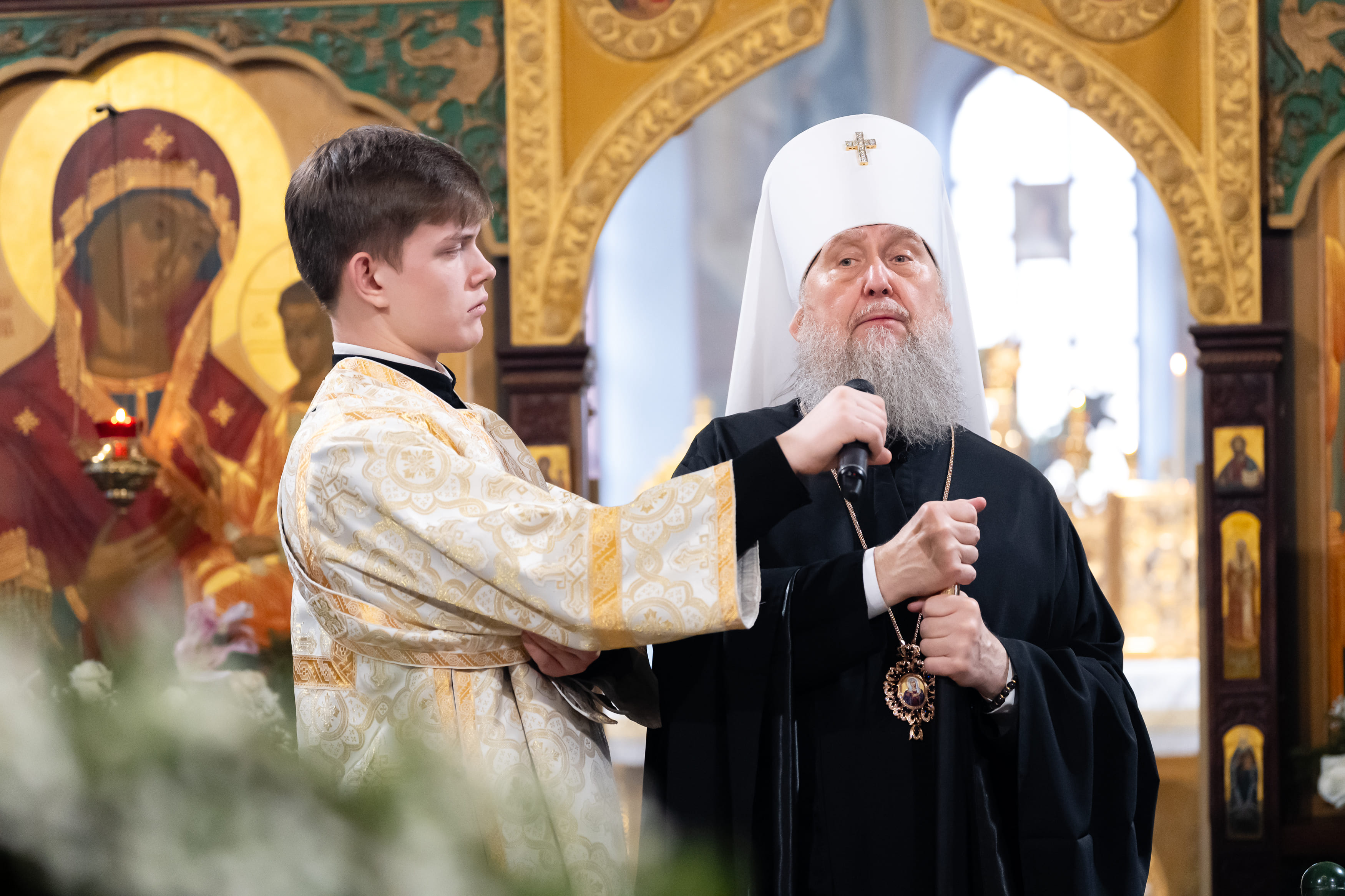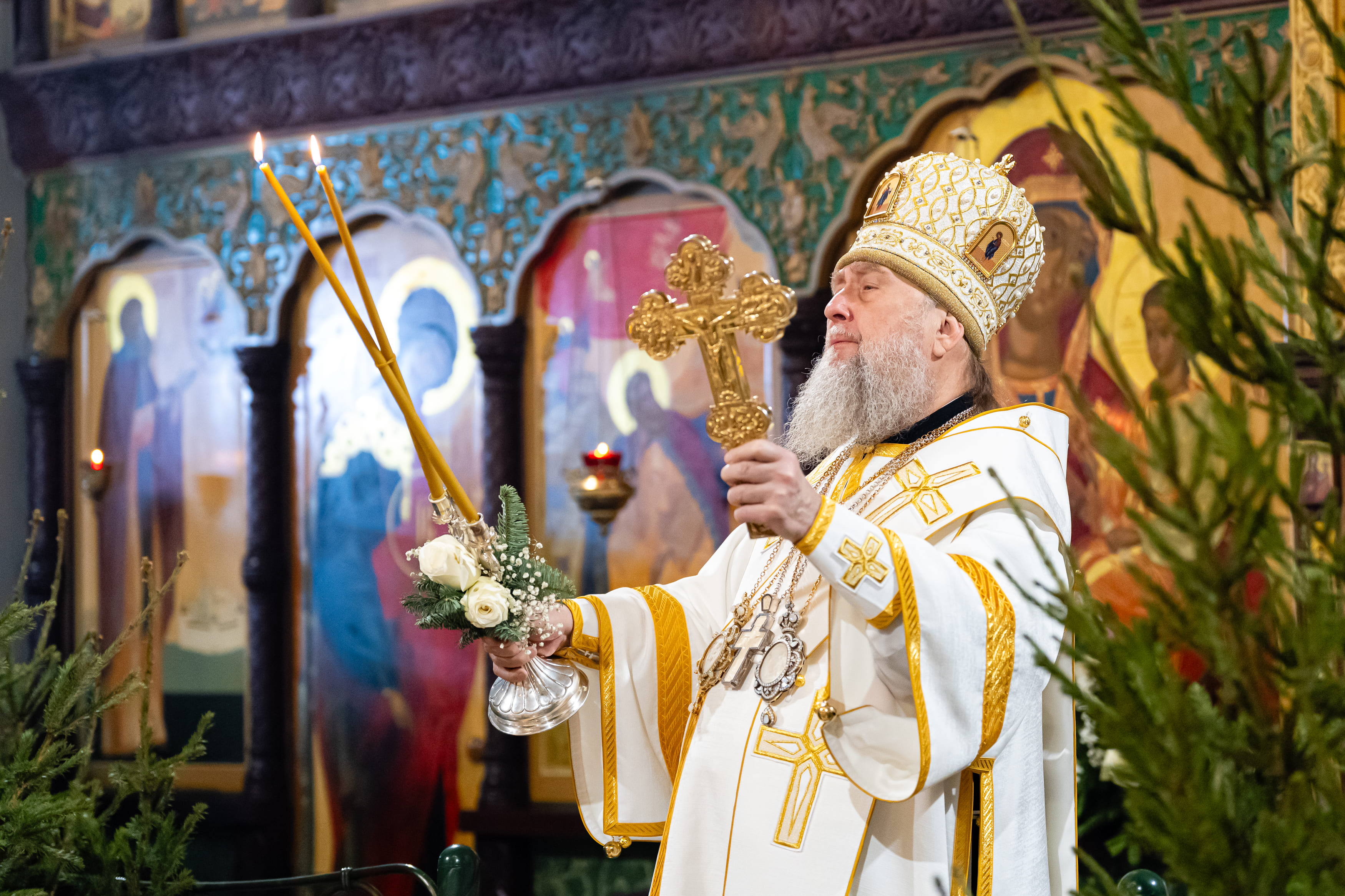 В завершение Литургии состоялось славление Рождеству Христову, после которого митрополит Александр поздравил архипастырей, духовенство и прихожан с праздником пришествия в мир Бога Слова и обратился к собравшимся с проповедью.