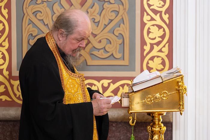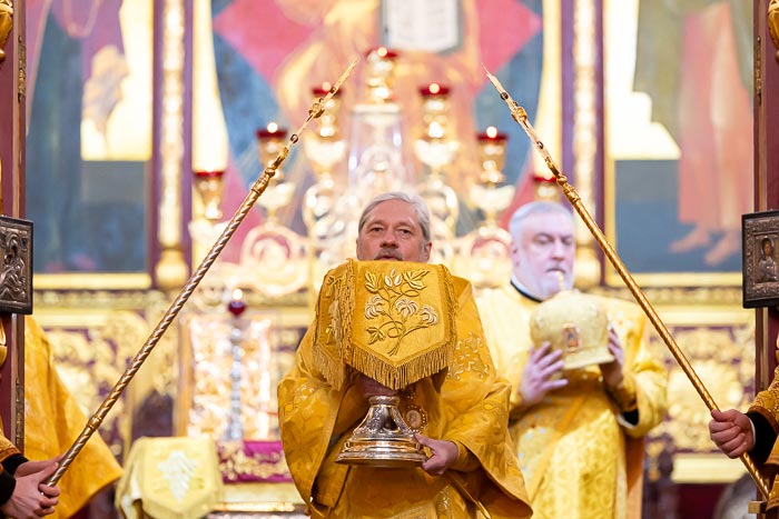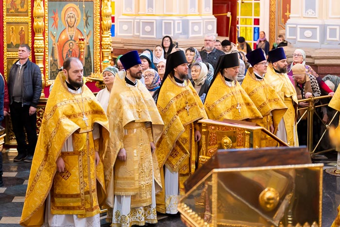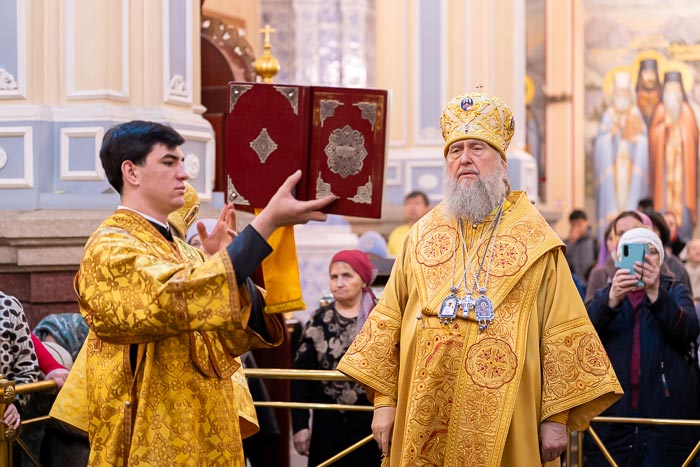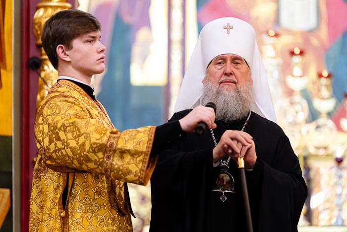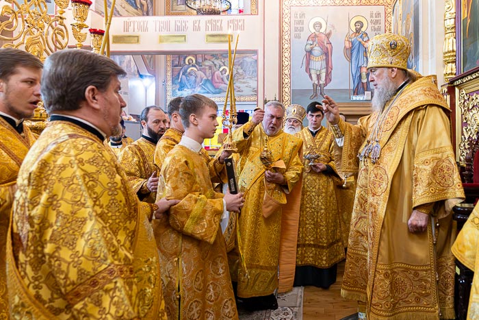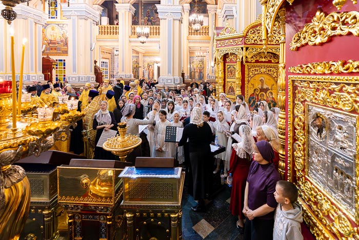 Литургия завершилась славлением великомученику Феодору Стратилату, после чего иерарх поблагодарил хоровые коллективы за молитвенное пение и