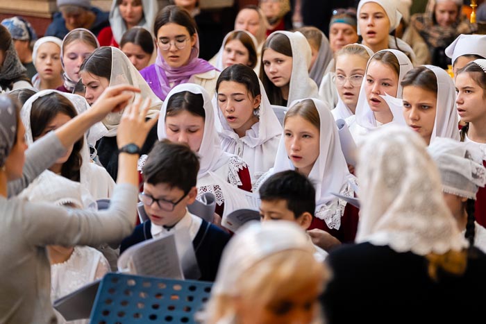Песнопения исполняли: певчие Московской православной хоровой студии «Царевич» (регент – Е.С. Тугаринов, хормейстер – А. Тугаринова) и сводный детский хор воскресных школ Южной столицы (регент – Н. Головина, хормейстер – О. Картаузова).
