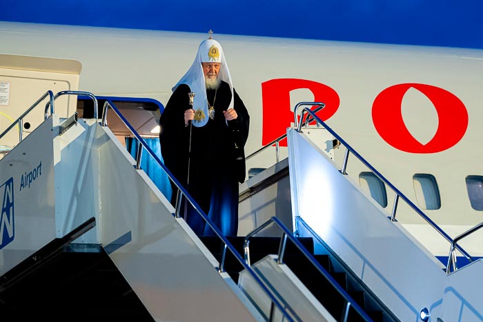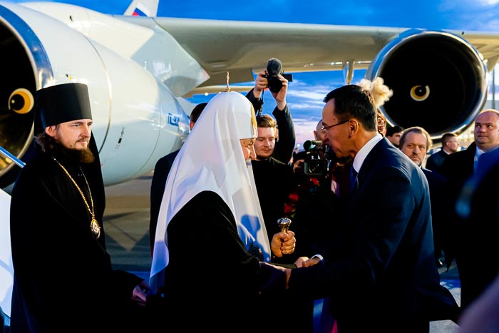 В международном аэропорту города Астаны Предстоятеля Русской Православной Церкви встречал митрополит Астанайский и Казахстанский Александр, Глава Митрополичьего округа в Республике Казахстан и Председатель Сената Парламента Республики Казахстан М.С. Ашимбаев.